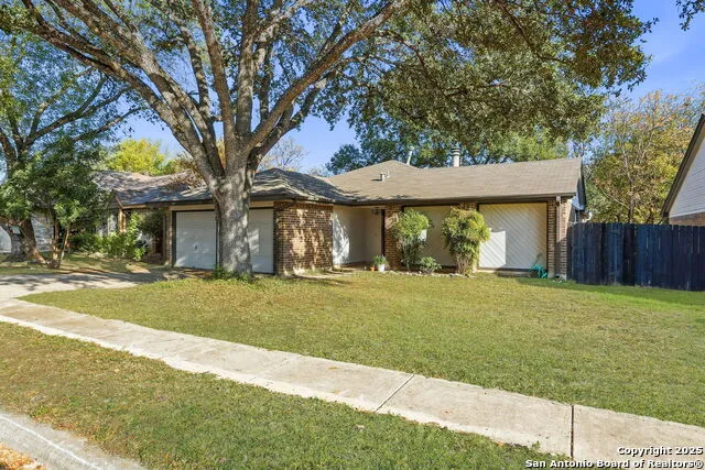 Single-story living * Greenbelt lot * Courtyard + covered patio * Near Culebra Rd and Loop 1604. This 3-bedroom, 2-bath home offers 1,798 square feet of single-story living on a fully fenced lot backing to a greenbelt. Built in 1983, the interior was remodeled in 2020 and features luxury vinyl plank flooring in the main living areas and kitchen, carpeted bedrooms, and neutral finishes throughout. Mature trees frame both the front and backyard, providing established outdoor space and privacy. The main living area includes a vaulted ceiling with exposed beam detail and a brick, wood-burning fireplace with gas starter. A separate dining area connects to the living space, while sliding glass doors provide access to the covered patio and backyard. The kitchen features white shaker-style cabinets, granite countertops, a tile backsplash, stainless steel appliances, an electric range, a built-in microwave, a dishwasher, and a deep basin sink with gooseneck faucet. The breakfast area opens to a private courtyard, creating an additional outdoor seating or dining space. The primary bathroom includes a dual vanity with stone countertop and a walk-in shower with glass enclosure. Secondary bedrooms include ceiling fans and standard closets. Additional features include a two-car garage, level lot, and a roof replaced approximately seven years ago. HVAC updated in 6/25 and spray foam insulation added for better energy efficiency. Located near Culebra Road and Loop 1604 with convenient access to Alamo Ranch shopping and dining. Situated in the highly regarded Northside ISD and close to parks, shopping, and dining, this home combines location, functionality, and access to community amenities. The HOA includes a pool, park and playground, sports court, BBQ grill, jogging trails, bike trails, clubhouse, tennis court, and basketball court. Includes a 3D tour or floor plan viewer. Don't miss the opportunity to make this single-story home your next move in Northwest San Antonio!